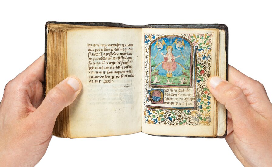 This charming Book of Hours was made circa 1460 in Troyes or Besançon by the Master of the Troyes Missal, an illuminator that François Avril describes as "la personnalité la plus marquante de l'enluminure troyenne à partir de la moitié du XVe siècle" (i. e., the most striking personality of Troyes illumination from the mid-15th century). This illuminator is named after the magnificent Missal made for a private chapel in Troyes, today preserved in the national library of France, in Paris (ms. lat. 865A). His recognizable style is characterized by a graphic touch and effective compositions, as well as relatively expressive figures with stout bodies. The Master of the Troyes Missal is the only illuminator active in Troyes in the mid-15th century to have succeeded in establishing a local tradition: before his arrival, the art of illumination in Troyes was conditioned by the artists and the libraries in Paris.
