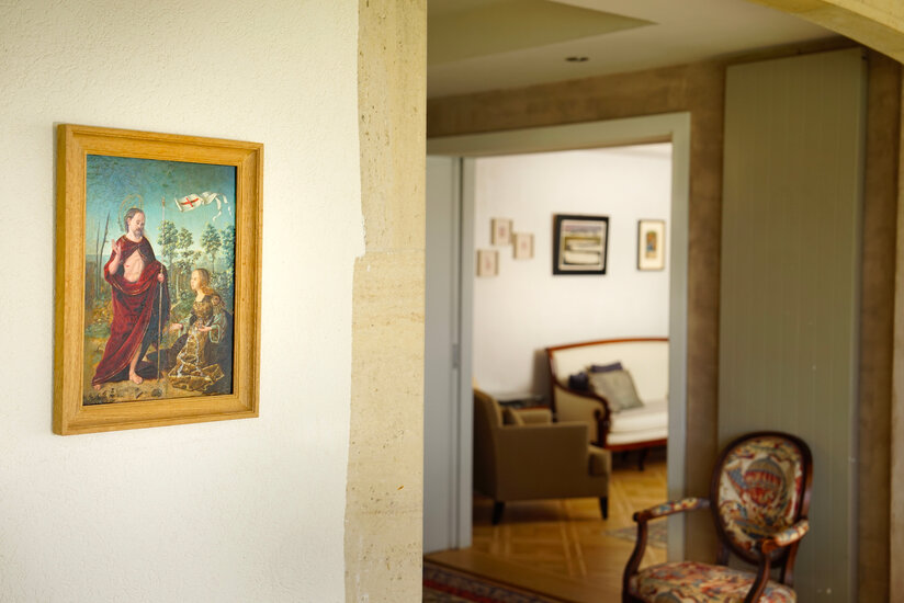 Harald Erath grew up surrounded by a Catholic environment. From an early age, he was captivated by Medieval art, its symbols, and aesthetics. His work, and especially the present painting, reflects a strong influence from Late Medieval German art, with meticulous brushwork and exaggerated features (such as the treatment of the skin) reminiscent of that era. The painting's glossy finish enhances its vibrant colors, reminiscent of Medieval altarpieces, achieved through his use of egg tempera on wood - a technique from the Middle Ages.