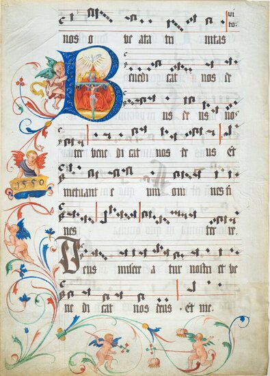 The depiction of the Trinity in the initial "B" follows the traditional Throne of Grace (Gnadenstuhl) motif, showing God the Father crowned on a heavenly throne, supporting the Cross with the crucified Christ, while the Holy Spirit is represented by the radiant dove. The leaf is also decorated with elaborate floral motifs in the margins, with putti playing among the foliage. The lower margin, two naked putti playing, while in the left side margin, one putto climbing, another supports a cartouche with the date 1550, and a third, dressed, supports the initial.