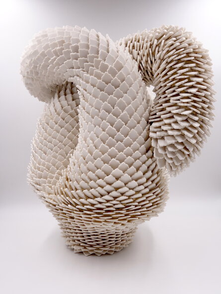 Peled's work examines the beauty and brutality of the natural world. Her sculptural language is formed by her surrounding landscapes and nature, and engages with themes of memories, identity, and place. Her sculptures and installations consist of thousands of hand-crafted porcelain shards; a technique that yields a texture both delicate and severe. In some works, large scale-like ceramic pieces appear airy, delicate, and fluffy, as if one's breath might break it. In others, Peled's fragments are geometric barbs that mysteriously take on an alluring form - offering a sense of softness despite a sharp actuality.