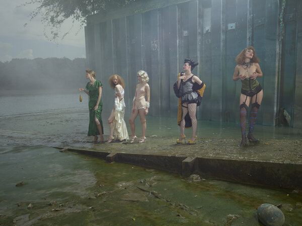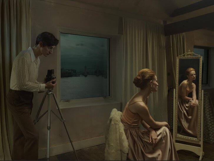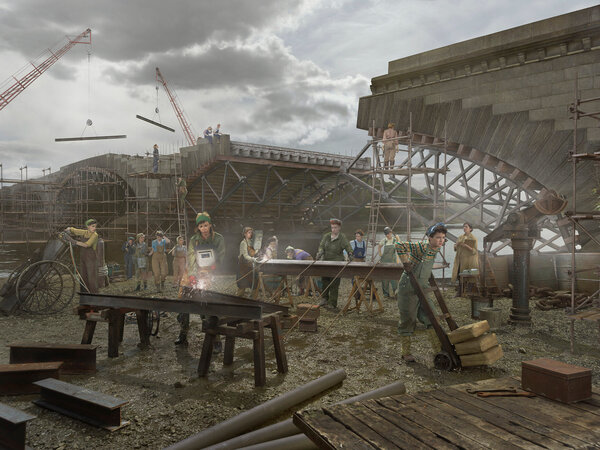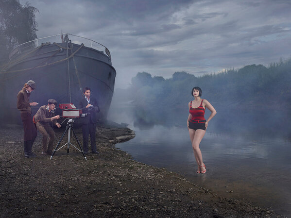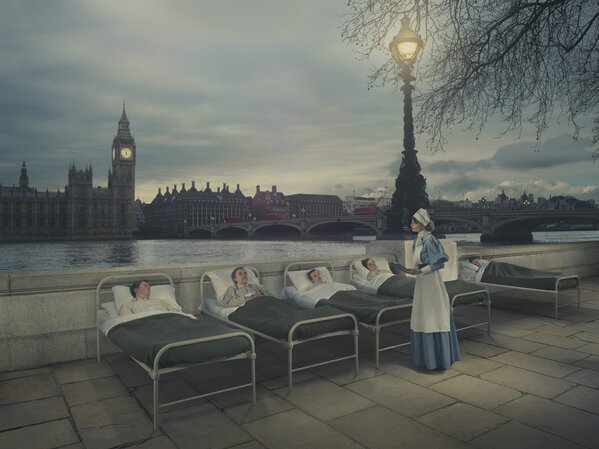 Tuberculosis was a predominant cause of death among all classes until the end of WWII and the advent of antibiotics. It was for years associated with many renowned artistic people either having the disease or surrounded by people who did, and was also known as “the romantic disease”. For a long time the only known cure was believed to be housing afflicted persons in open air sanatoria. As a young child my grandmother was suspended in an apple tree in the garden. My image shows male tuberculosis patients resting in their hospital beds in the open air outside St Thomas’ Hospital on the banks of the River Thames, opposite the Houses of Parliament, and being cared for by a beautiful young nurse. The inspiration for this sequel to my Old Father Thames project is a 1936 black and white image hanging in a corridor in the hospital.