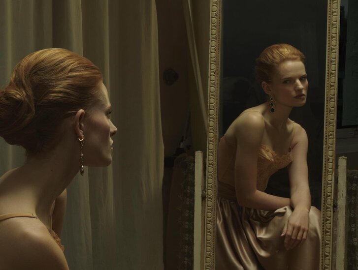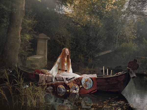 My image is based on the famous 1888 painting made by the Pre-Raphaelite artist John William Waterhouse, ‘The Lady of Shalott’. He portrays ‘The Lady’ as she sits in the boat as a sorrowful maiden dressed in virginal white. He heightens her sensuality with bright red lips, long flowing hair, and a low-slung sash. She has just cast off from the island, the mooring chain is still in her hand, a crucifix lies near the bow of the boat and three nearby candles suggest her spirituality. But only one of the candles remains lit, a portend of the fateful future awaiting her. The tapestry that drags in the water is one that she had woven on her loom during her lonely days in the tower.