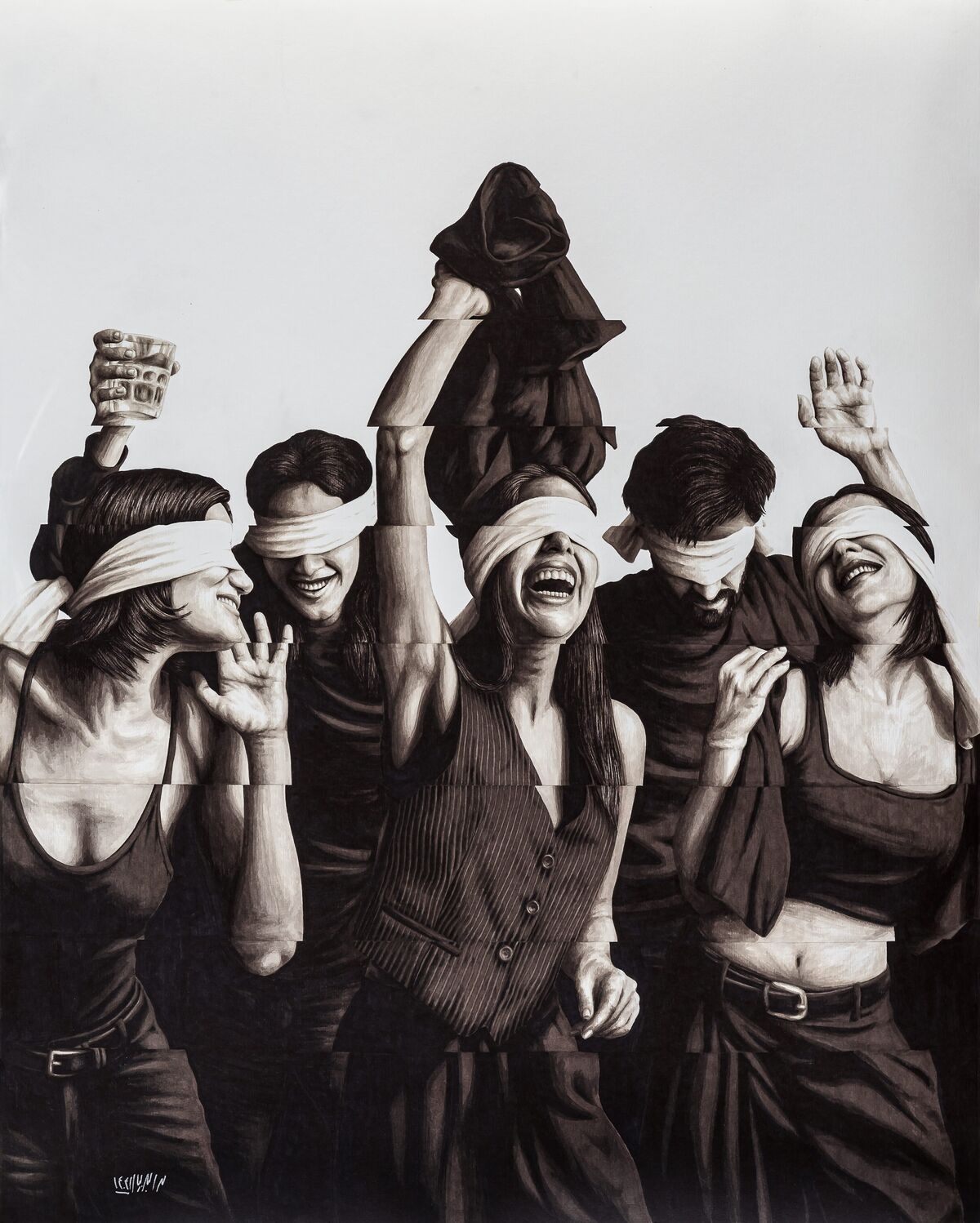 Lohrasb Bayat investigates methods of image construction that probe our state of ambiguity and multiple possibilities, just as the the blindfolded figures dance and laugh with an exuberance that defies their predicament. Embracing the uncertainty of their existence, laughing and moving with a sense of assumed liberation, evoking vulnerability and optimism at the same time.