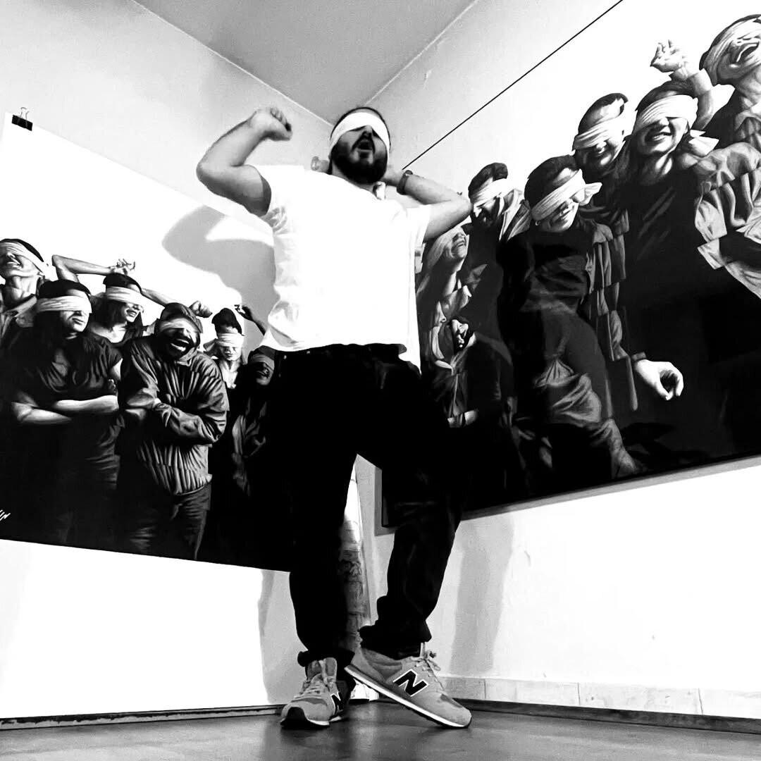 Central to the series are Bayat’s blindfolded figures, suspended mid-movement in a dance of both restraint and release. Rendered through precise, dynamic linework, these anonymous seeming subjects embody the tension between limitation and liberation—mirroring humanity’s capacity to adapt and thrive within constraints. Each composition pulses with emotion, capturing fleeting moments of joy, doubt, and connection that define our shared journey.