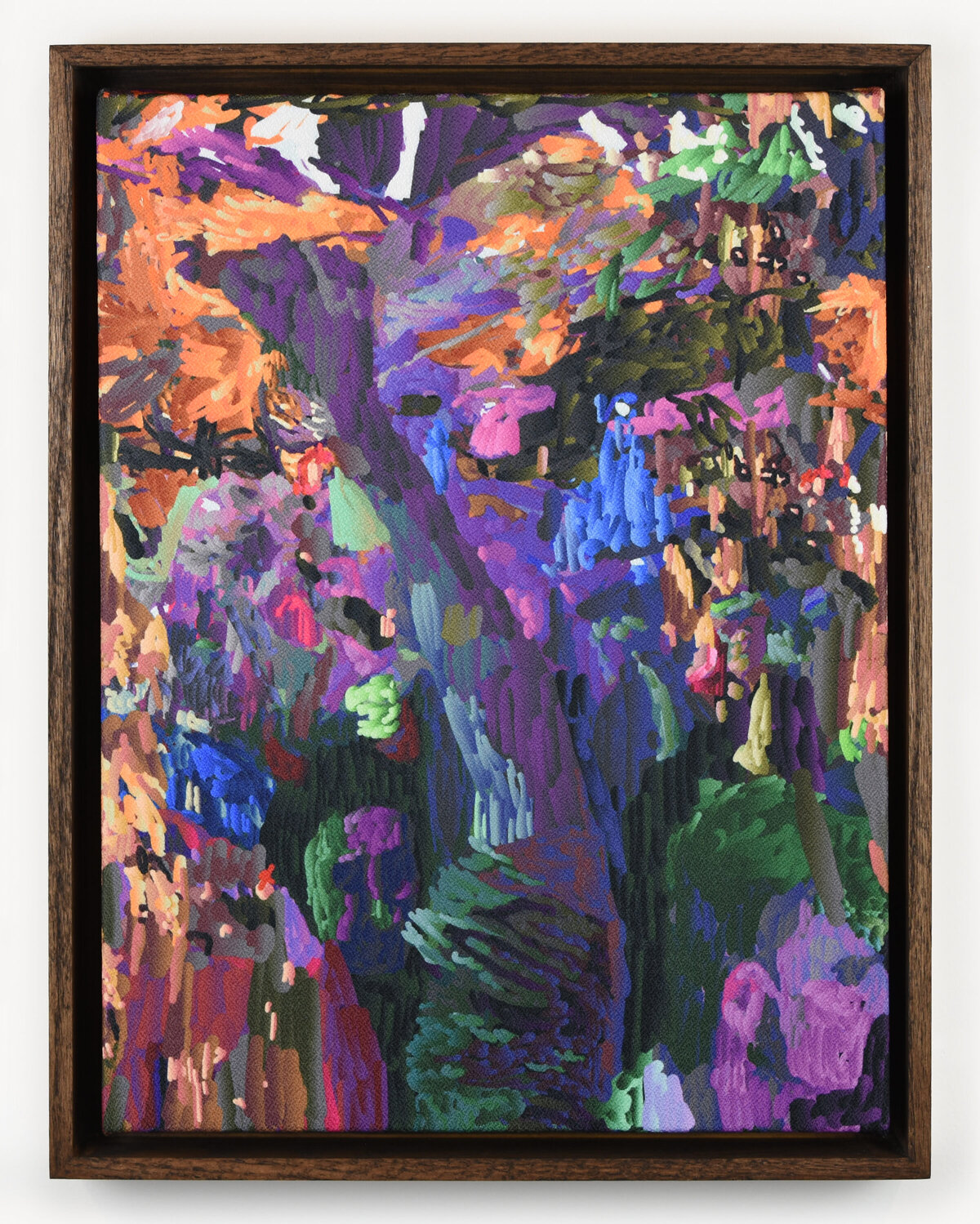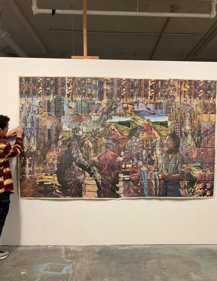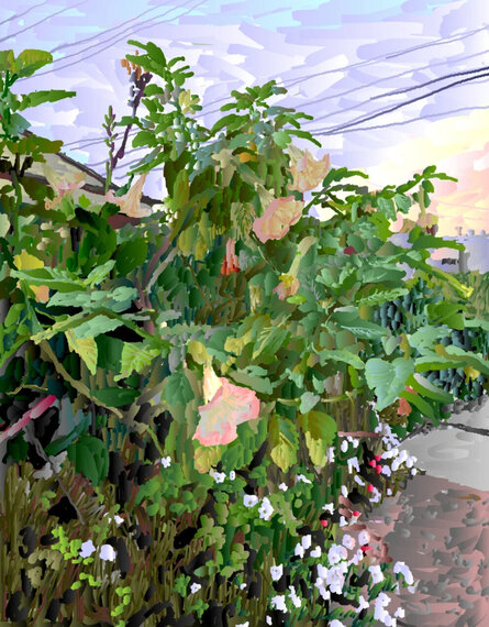 Golden Hour in Boston-Edison depicts a neighborhood path awash in afternoon light. The scene is rendered using the artist’s custom digital painting software, where densely layered marks suggest the flickering complexity of sunlight and foliage. A layer of embroidery overlays the surface, catching real light and adding a tactile dimension to the painted illusion.