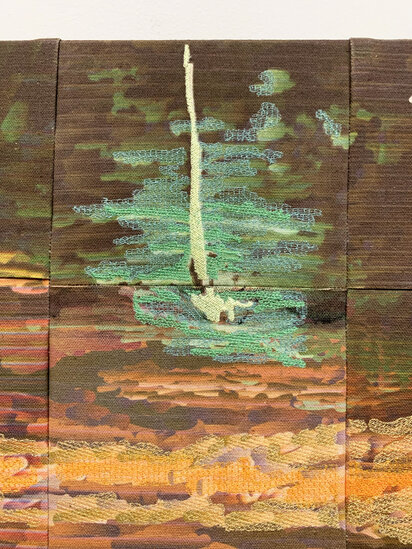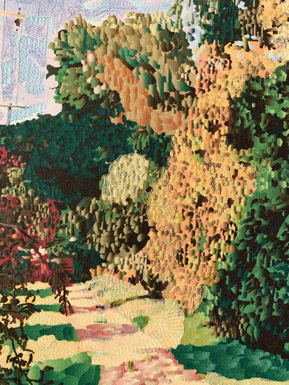 Golden Hour in Boston-Edison depicts a neighborhood path awash in afternoon light. The scene is rendered using the artist’s custom digital painting software, where densely layered marks suggest the flickering complexity of sunlight and foliage. A layer of embroidery overlays the surface, catching real light and adding a tactile dimension to the painted illusion.