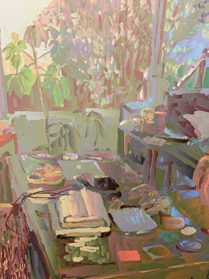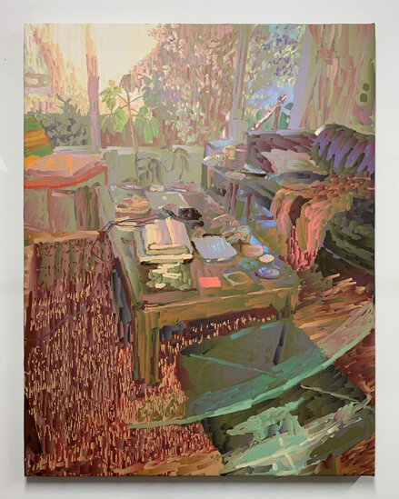 Living Room at Golden Hour captures a sun-drenched moment in a domestic interior. The composition is based on a cell phone photograph, referenced in the artist’s custom digital painting software. He draws elements from the scene ebbing between photoreal details and softer, blocky strokes. Sunlight pours across the furniture, highlighting and color shifting small details. The painting invites close viewing, rewarding attention to surface, texture, and the emotional resonance of familiar spaces.