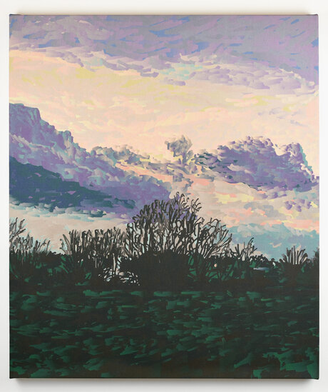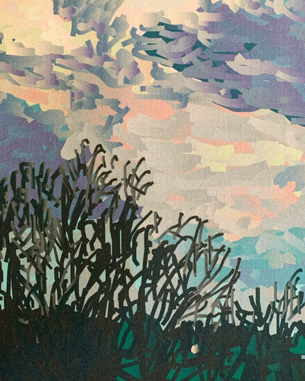 Dusk in Iowa captures the final light of day over a rural landscape drawn from a cell phone photograph. The image is referenced in the artist’s custom digital painting software, where brush-like marks are built up in layers of vector shapes and gradients. The silhouetted treeline contrasts with a luminous sky rendered in dappled strokes of violet, pink, and pale yellow. The painting moves between observation and abstraction, grounding a fleeting scene in graphic clarity and atmospheric depth.