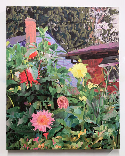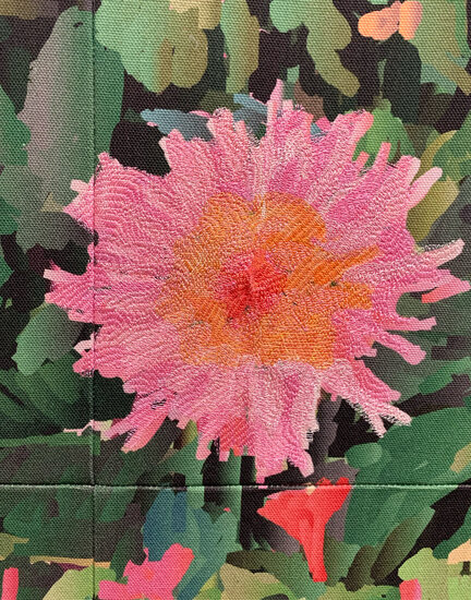Garden House in Hazel Park depicts an untamed, sprawling flower bed seen from a pedestrian’s passing glance. The artist added physical layers of embroidery on the flowers in the scene, adding visual depth and detail to the work. Tiles of canvas are quilted together and stretched to resemble a traditional painting. These details combine to present a sense of stillness and vibrancy embedded in natural moments of beauty.