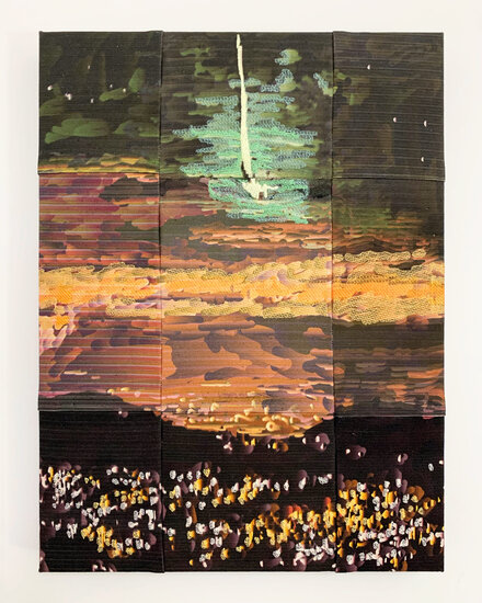 May 2020 (unknown night sky) presents a mysterious and atmospheric skyscape rendered in digital mark-making and layered textile work. Painted using the artist’s custom software, the image employs sweeping tonal gradients to evoke a moment suspended in time. Embroidery and quilted stitching overlay the surface, catching light and introducing a tactile contrast to the screen-like flatness of the image.