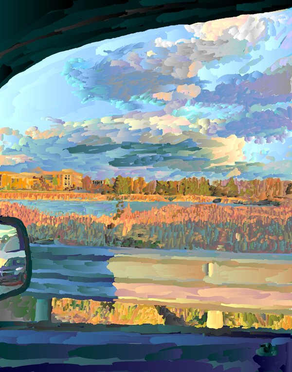 This roadside vista elevates an ordinary commute into a contemplative moment. Created in the artist's custom digital painting app using hand-drawn vector brushstrokes, the piece refernces a cell phone photo captured through a car window. The digital medium allows for both atmospheric depth in the golden wetlands and precise detail in the rearview mirror glimpse, merging the intimate vehicle interior with the expansive landscape beyond in a way unique to the artist's process.