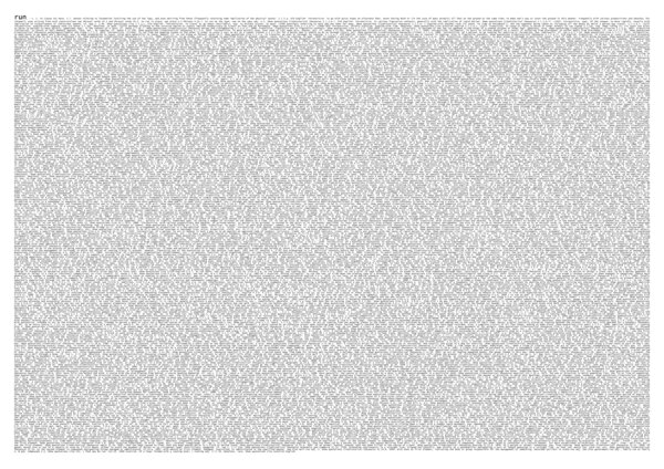 The script is the full definition of ‘run’ in verb, noun, and adjective forms as it appears in the O.E.D’s (Oxford English Dictionary) current edition (2011). This contains 371 separate meanings for the word, the second highest in the English language after ‘set’; however, O.E.D. announced in 2021 that in the forthcoming edition (2037), the definition of ‘run’ will further expand to a total of 645 meanings, overtaking ‘set’ to become the longest definition in the English language. The majority of these definitions account for increased usage of ‘run’ in newly emerging operational, technological, and computational contexts. The suggestion is twofold, that the development of the word is indicative of the (English-speaking) world ever more in a state of activity over settledness, and that conversely, the manner of that activity is ever more fixed in place.