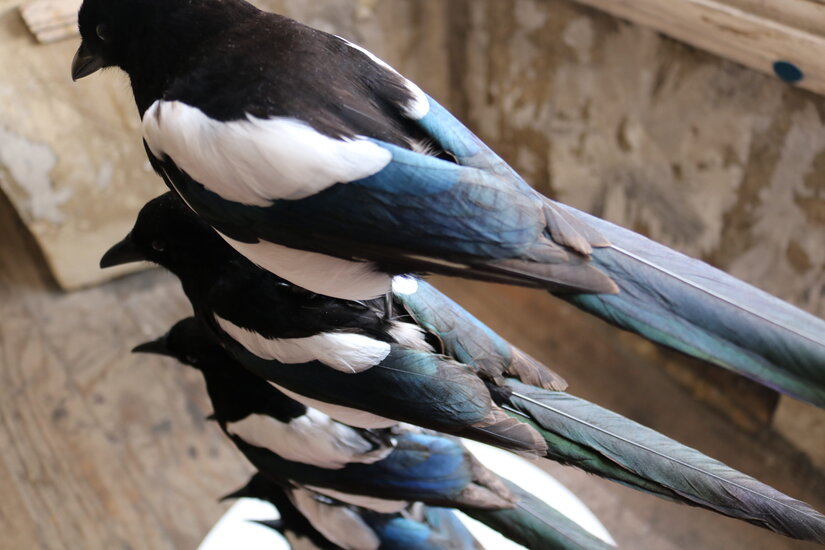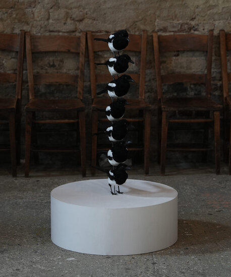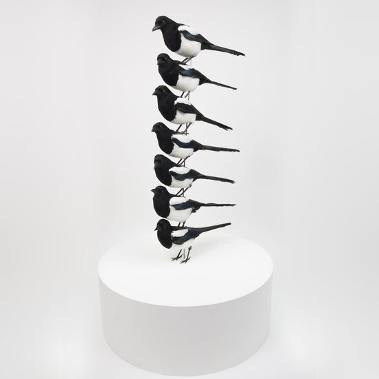 Seven magpies are stacked atop one another, similar in form to the animals from the Brothers Grimm tale ‘The Town Musicians of Bremen’. The work is titled in reference to the UK folk poem/nursery rhyme, which goes: