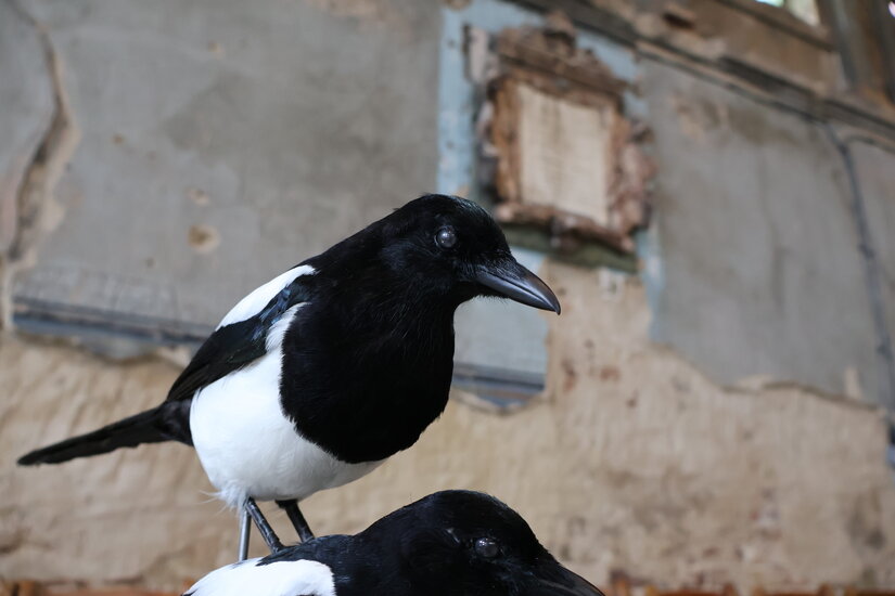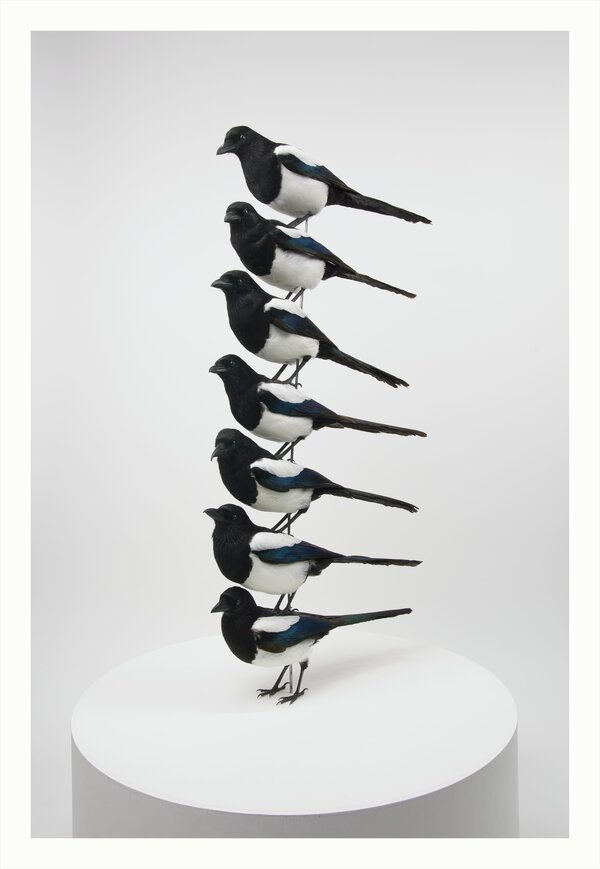 Seven magpies are stacked atop one another, similar in form to the animals from the Brothers Grimm tale ‘The Town Musicians of Bremen.’ The work is titled in reference to the UK folk poem/nursery rhyme, which goes: