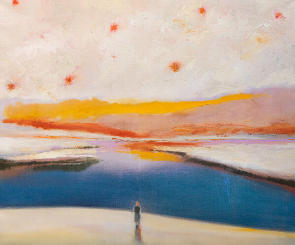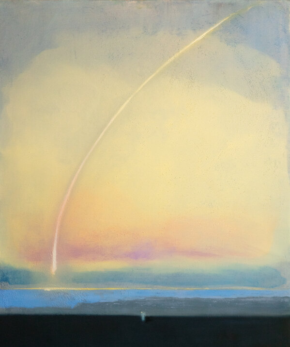 The artist sometimes imagines a pensive person standing at the end of the world. What will be left or forgotten at the beginning of this and the next era? When the sun goes over the horizon at last, what will we see in the remaining sea? To ask these questions, the artist put metaphors of a horizontal line that embraces both the beginning and the end, as well as a meteor that continues the old myth of making a wish come true.