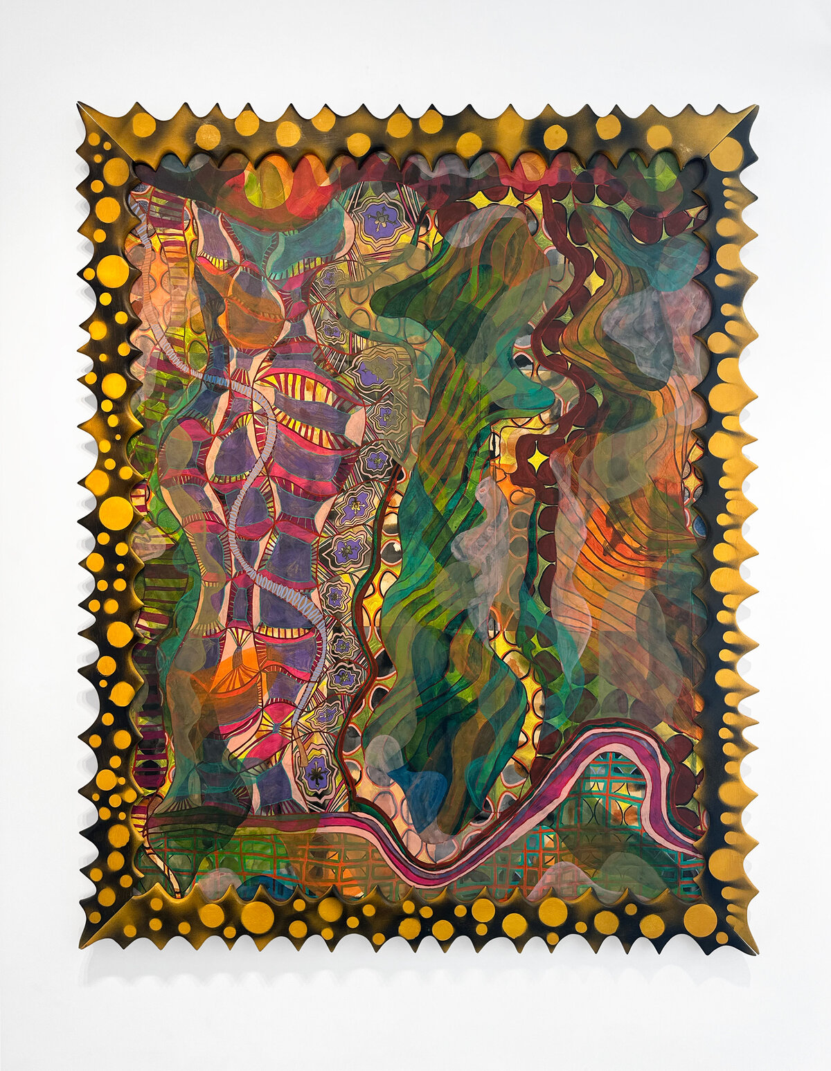 Opoku’s meditative dreamscape, realised through fluid and repetitive mark-making, considers the psyche a portal where healing, failure and transformation coexist. Opoku finds spiritual architecture in intuitive form and pattern, building layered worlds that resist linear temporalities and fixed identity.