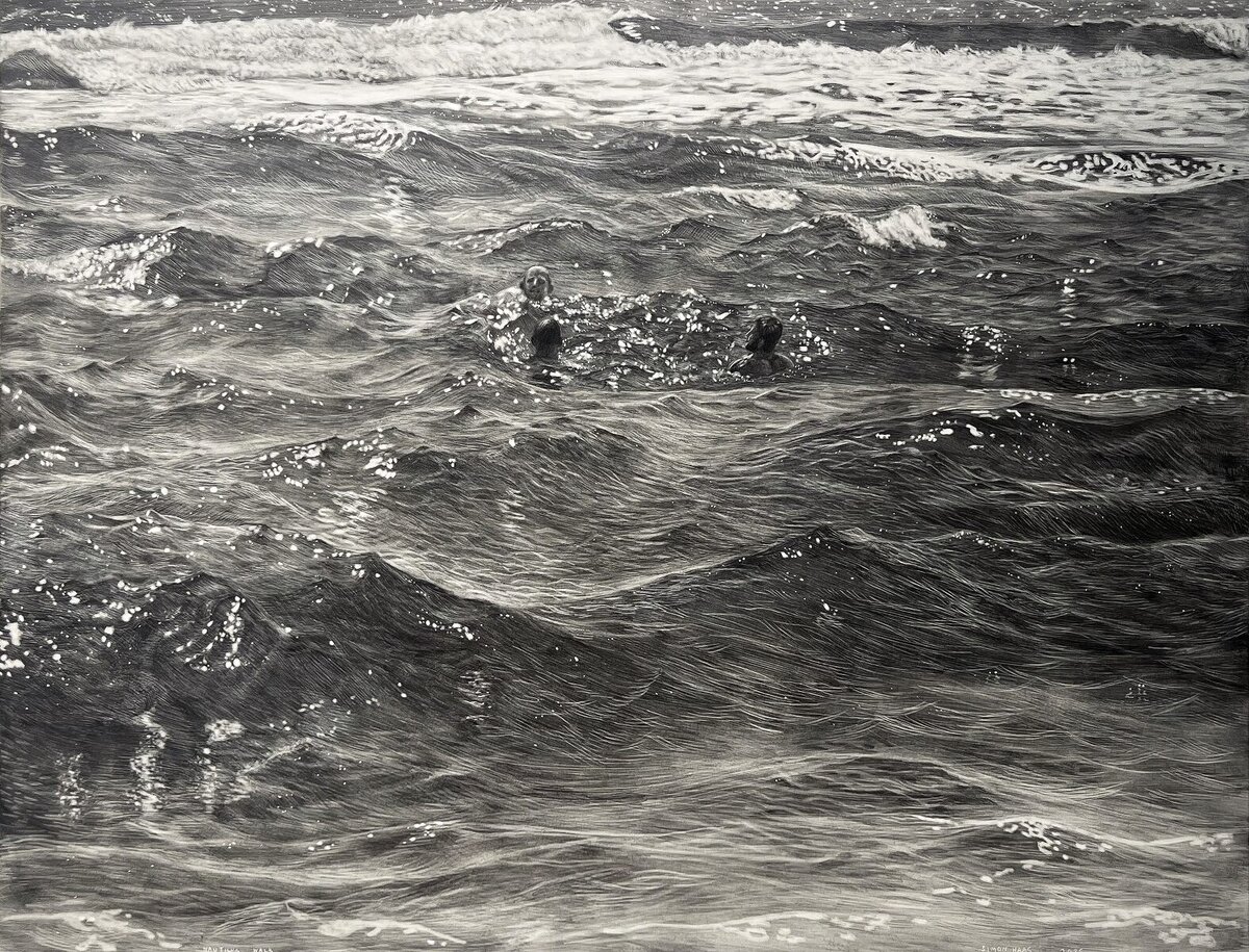 Simon Haas’ graphite drawing distills a personal moment of this same togetherness. Haas’ rendering captures his husband and two beloved friends swimming against the shifting tides off New York’s Fire Island – a storied stretch of coastline long cherished as a haven for the local gay community.
