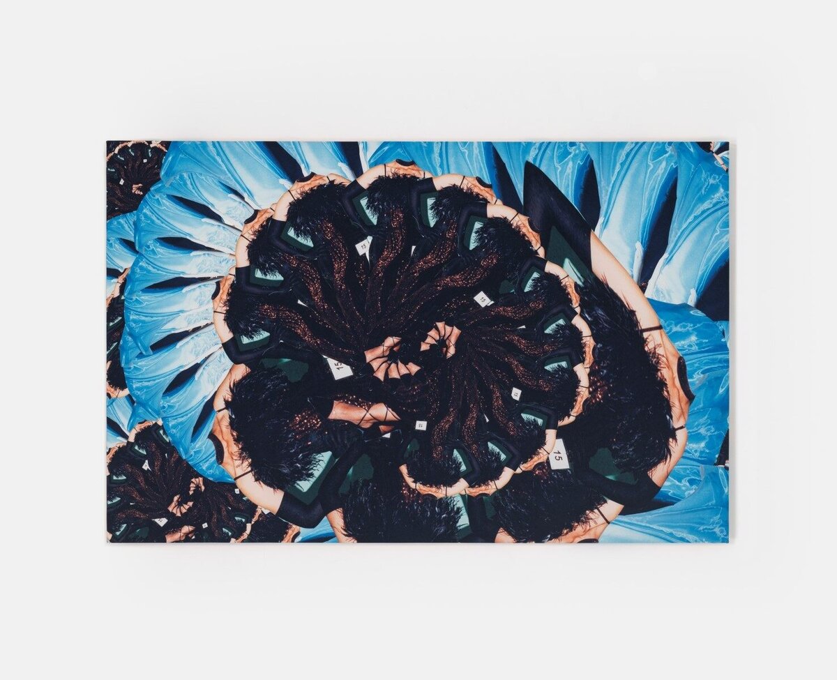 The portrait has retained its radical value, emblematic of Muholi’s world-building impulse to image and illuminate alternative lesbian and non-binary corporality. Queezy’s kaleidoscopic digital print interweaves family photographs with archival images from Miss Gay Western Cape, an ongoing Cape Town-based pageant first held in 1996.