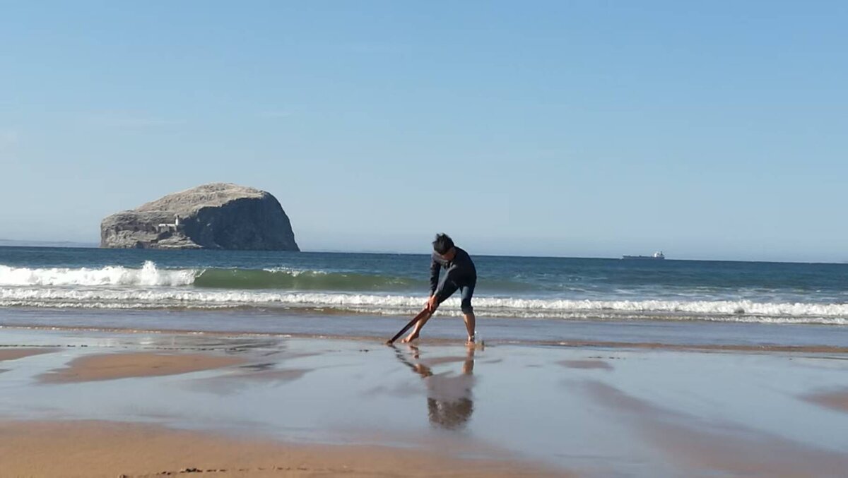 In Lin Chun’s performance "Drawing Waves", a Dadaist gesture unfolds through a seemingly futile act. Since 2017, the artist repeatedly tries to capture the ocean’s waves by drawing them at different shorelines, but each wave inevitably washes away the marks, erasing every attempt. This Sisyphean cycle of creation and erasure embodies a delicate balance between absurdity and poetry.