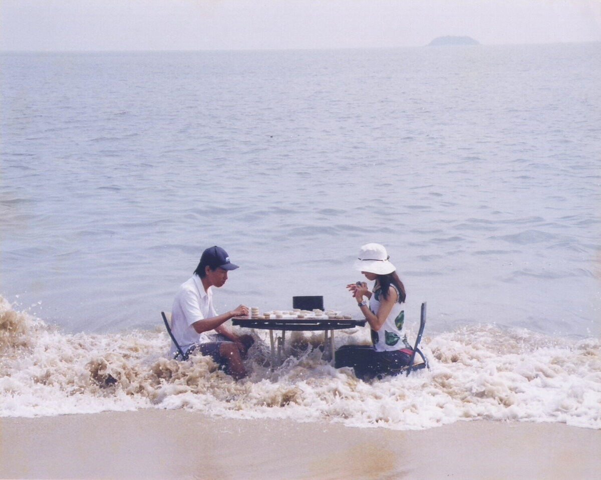 “Playing Water Chess” was performed at the narrow stretch of sea between Lin's city of residence Xiamen and Jinmen (Taiwan), similar to how the Chinese chess board is divided by a river, separating the players' sides. For the performance, he invited a Taiwanese student to play chess with him by the sea. The performance took place at low tide on the Eastern coast of Xiamen—directly across from Jinmen. As the tide rose, the chessboard was overturned by the water, leaving neither winner or loser.